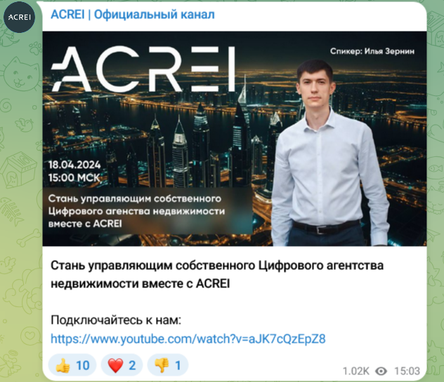 На Ютуб-канале спикер Илья Зернин рассказывал, как можно выгодно вложить деньги с помощью Acrei, сколько можно заработать. Однако в сентябре 2025 года канал удален из соцсети.