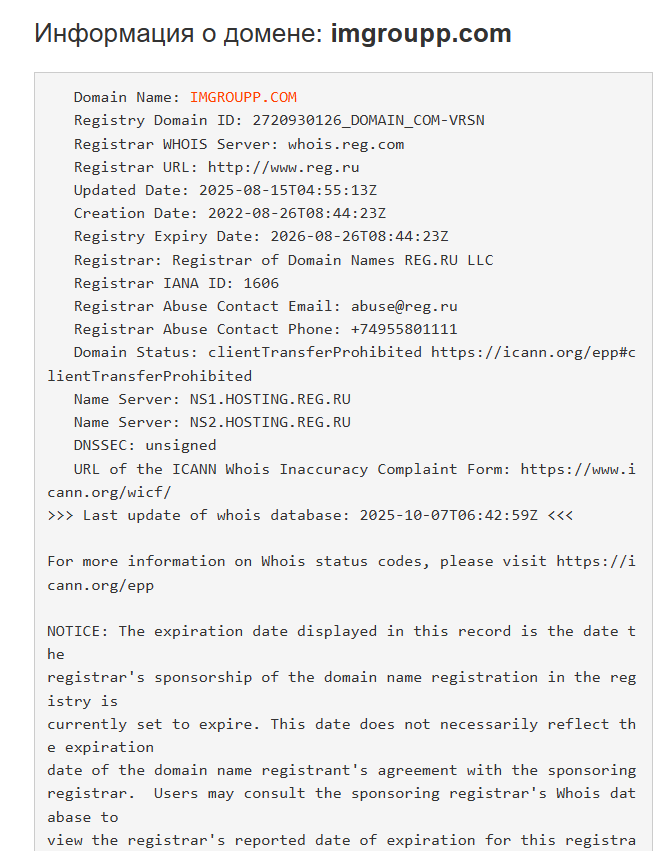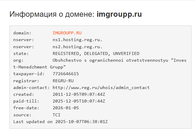 У компании 2 домена: Imgroupp com и Imgroupp ru. Они созданы в разное время, в 2022 и 2011 году соответственно. Один – ровесник организации, другой зарегистрирован позже, видимо, когда деятельность расширилась.