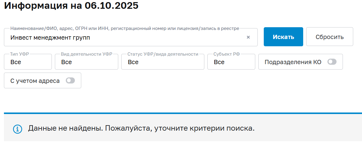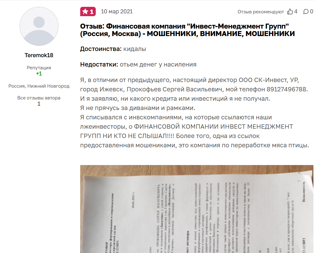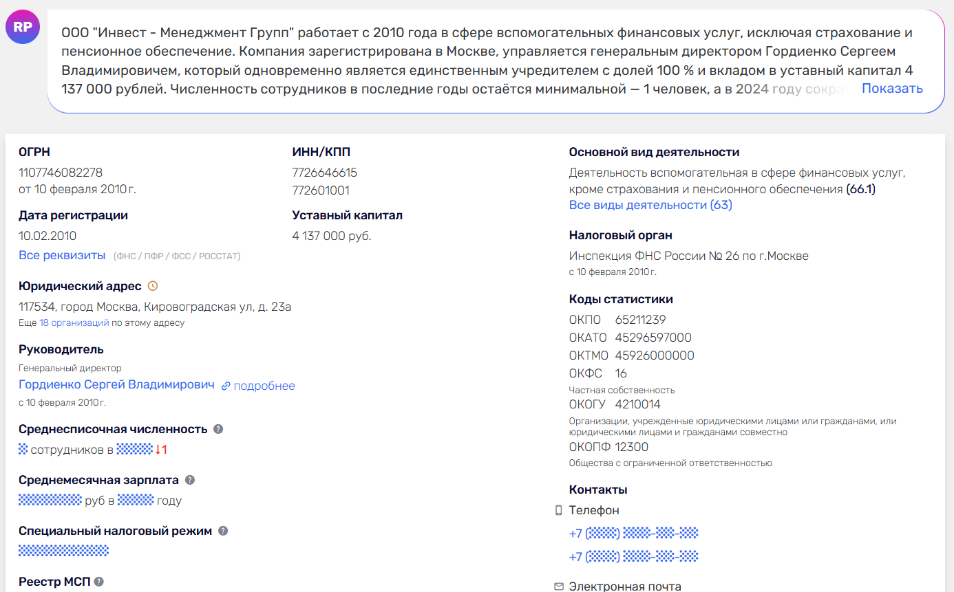 Во всех сферах компания «Инвест менеджмент групп» обещает гибкие сроки и низкие ставки. Она работает на рынке уже 15 лет и имеет официальную регистрацию. В компании всего 1 сотрудник. Также она находится под секторальными санкциями, а в 2020 году выступала в арбитражном суде как ответчик и выиграла. Генеральный директор – Гордиенко Сергей Владимирович.