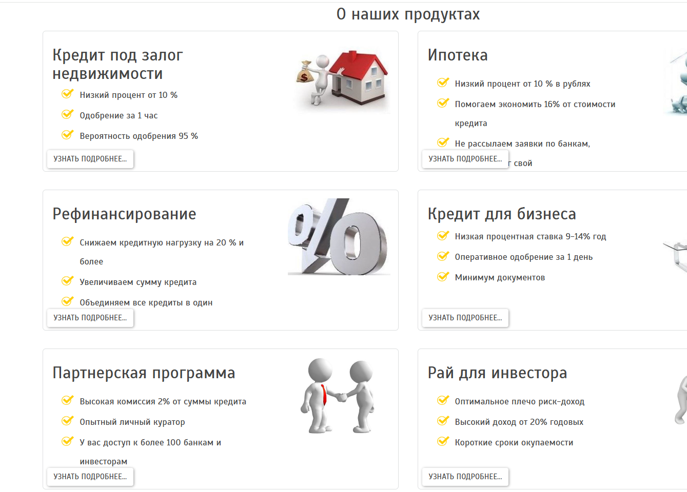 Imgroupp com – сайт для бизнесменов, которые ищут возможность получать долгосрочные инвестиции и кредитные средства. Фирма предлагает выгодные условия и обещает надежное и безопасное сотрудничество. Она предлагает разные варианты в том числе и частным лицам, а не только кредиты для бизнеса: кредит под залог недвижимости, ипотеку, рефинансирование, партнерскую программу, инвестирование в недвижимость.