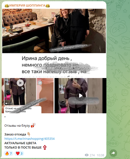 На тг-канал «Имприя Шопинга» Ирины отзывы встречаются в основном негативные, поскольку это магазин реплики одежды без реальных гарантий для клиентов. Товары у этой компании дешевле, чем у конкурентов на рынке, что может быть основной силой, привлекающей покупателей.