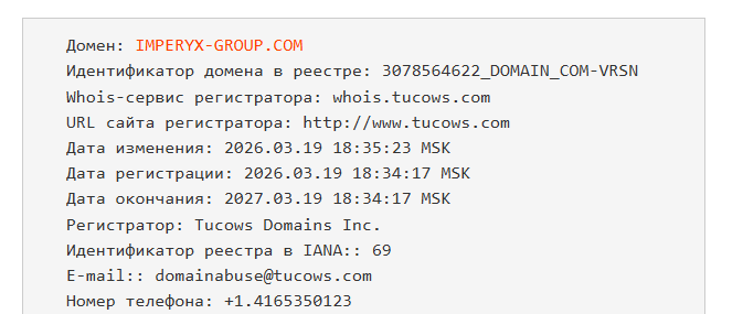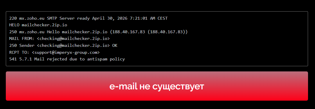 Адрес электронной почты Support@Imperyx-Group com указан в качестве единственного контакта с представителями компании, но даже он оказался фейковым, как видно по проверке с сайта 2Ip io.
