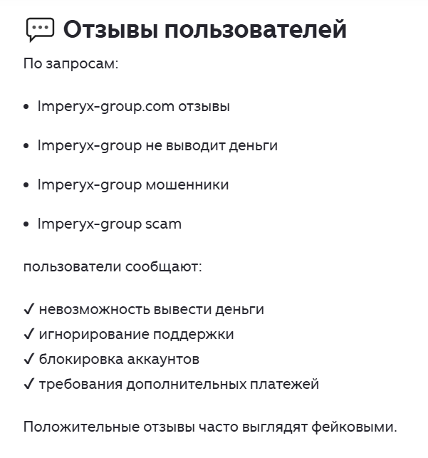 Проверка Imperyx Group показала огромное количество красных флагов, которые не только делают сотрудничество невыгодным, но и опасным, а так как даже пользователи пишут про обман и отсутствие обслуживания, связываться с таким проектом мы не советуем.