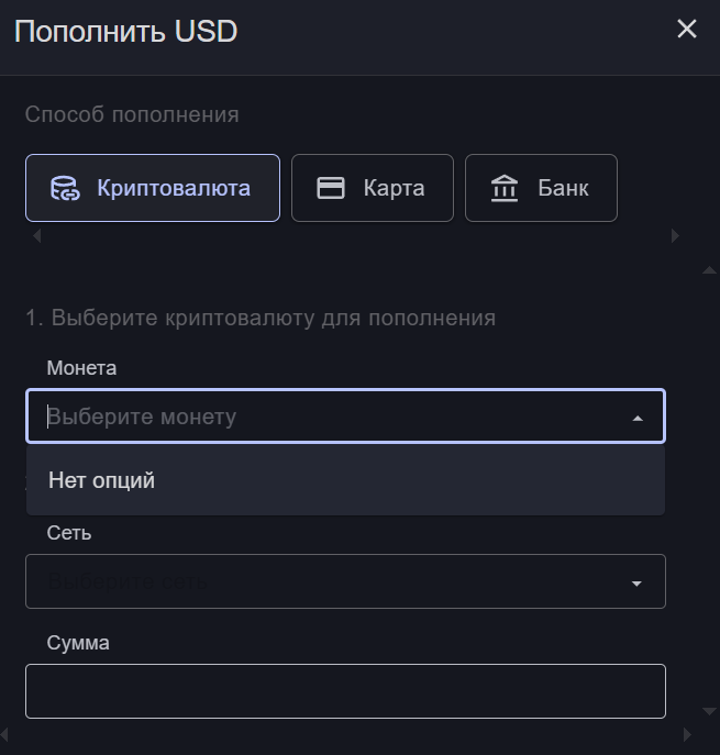 Среди платежных инструментов представлены криптовалюты и банковские карты, но при выборе цифровых активов Imperyx Group пишет «Нет опций», а в остальных случаях предлагают запросить детали.