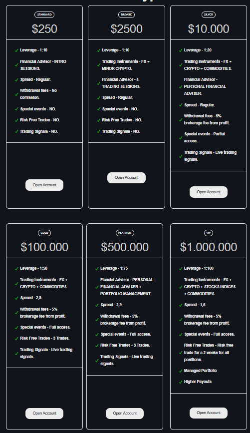 На Imperyx-Group com представлено шесть типов валютных аккаунтов, которые отличаются суммой внесения депозита, количеством торговых инструментов и размером спредов: