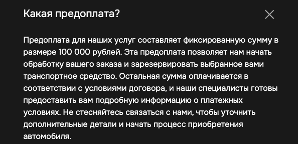 Предоплата, которую нужно внести – фиксированная, Она составляет 100 тысяч рублей. При этом формулировки о том, как и когда вносится остальная сумма – достаточно размывчатые: