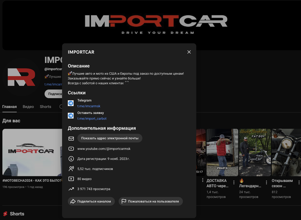 Полное название канала Import Car MSK и офис компании располагается на Федоскинской улице, бизнес был зарегистрирован в Краснодаре.