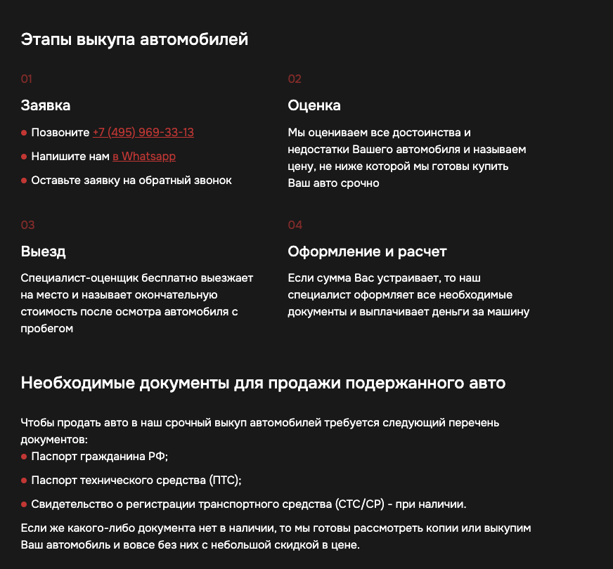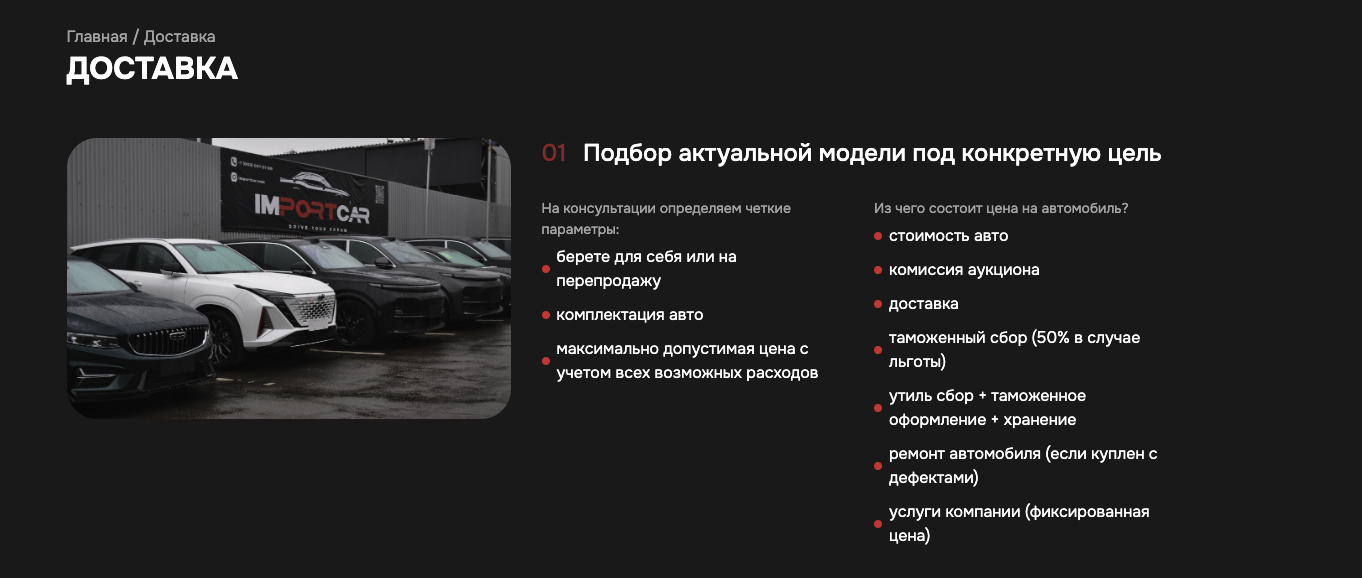 На сайте компании представлен большой выбор услуг, связанных с авторынком. Пользователи могут заказать подбор, доставку, пригон мототехники, а также оформить заявку на выкуп или сдать свое старое транспортное средство по программе трейд-ин.