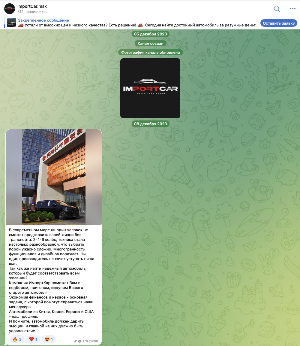 На Телеграмм-канал ImportCar подписано 312 человек. Он тоже был создан в 2023 году.