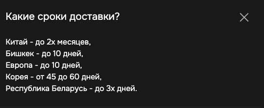 Сроки доставки составляют от пары дней до двух месяцев. Они зависят от страны, из которой осуществляется доставка: