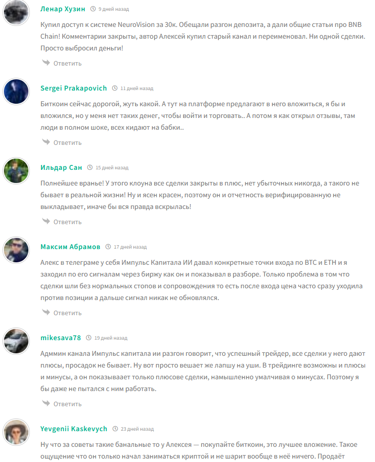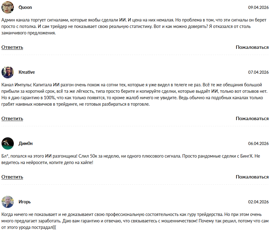 На нескольких сайтах есть отзывы о канале «Импульс Профита» от рядовых юзеров. Для полноценной проверки их недостаточно, но стоит отметить, что во всех комментариях прослеживается одинаковая точка зрения.