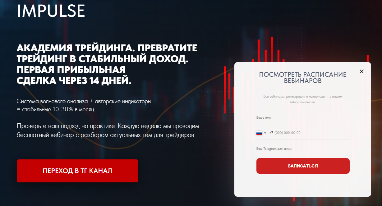 Сайт Академии трейдинга IMPULSE представляет собой обычный одностраничник. Платформа размещена на домене impulsacademy ru.