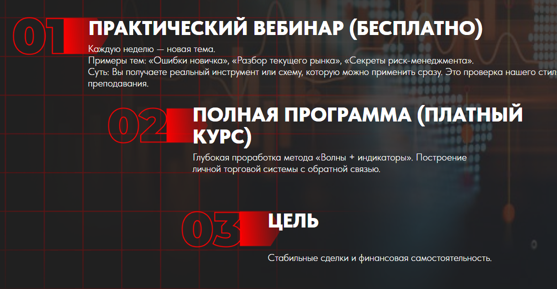 Программы курса не расписано, есть только краткий план бесплатного вебинара и платного курса. Расценки не указаны.