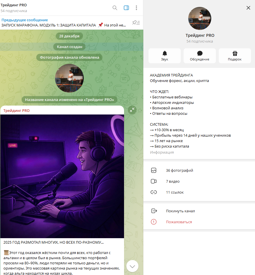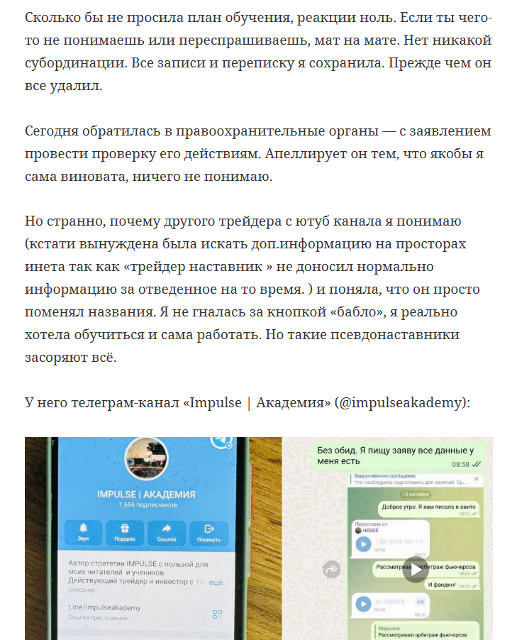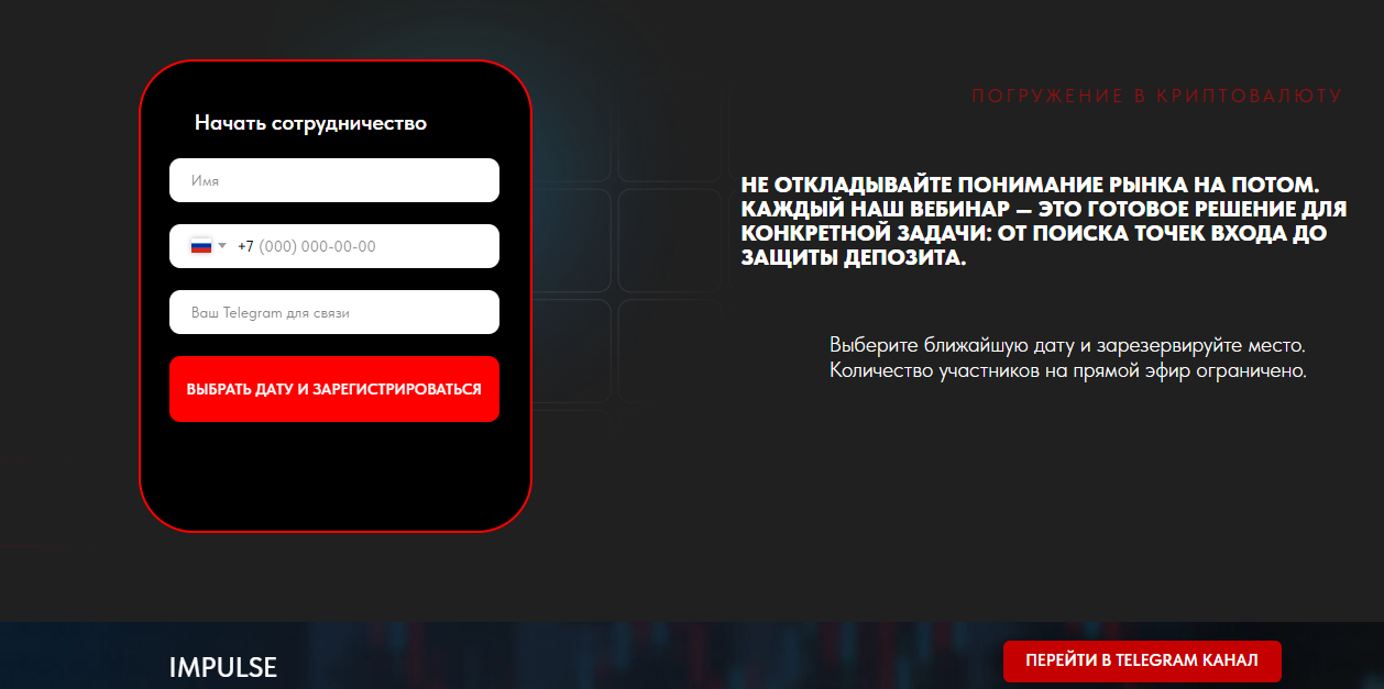 Для обучения пользователям предлагается заполнить форму обратной связи или перейти в Телеграм Трейдинг PRO (ранее IMPULSE Академия). Заметим, что аккаунт Дмитрия на этом канале не указывается.