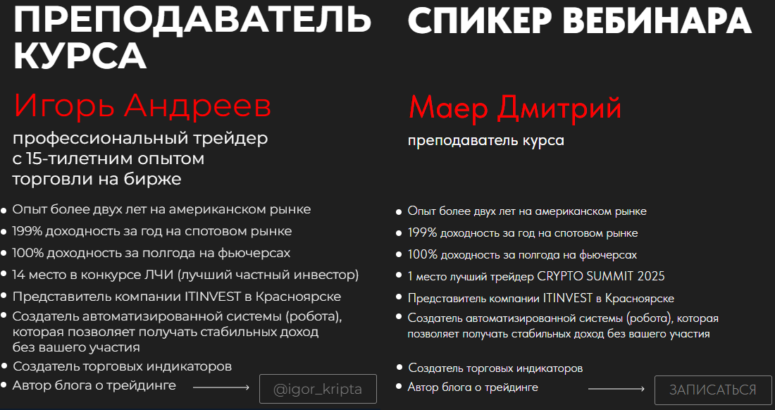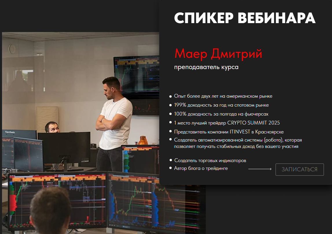 На сайте указано, что спикером выступает некий Дмитрий Маер. Среди его заслуг и успехов отмечено, что в трейдинге он более двух лет, доходность на фьючерсах составляет 100%, но статистикой это, разумеется, не подтверждается. Все остальные перечисленные заслуги также не находят подтверждений, так как в сети вообще нет информации о криптоэксперте Дмитрии Маер. Маловероятно, что реальная личность не оставила бы цифрового следа.