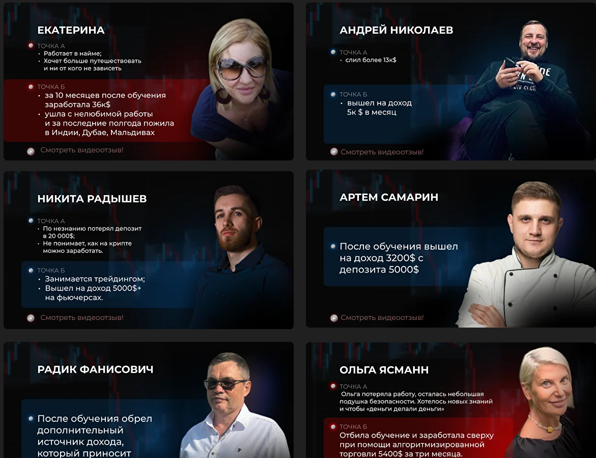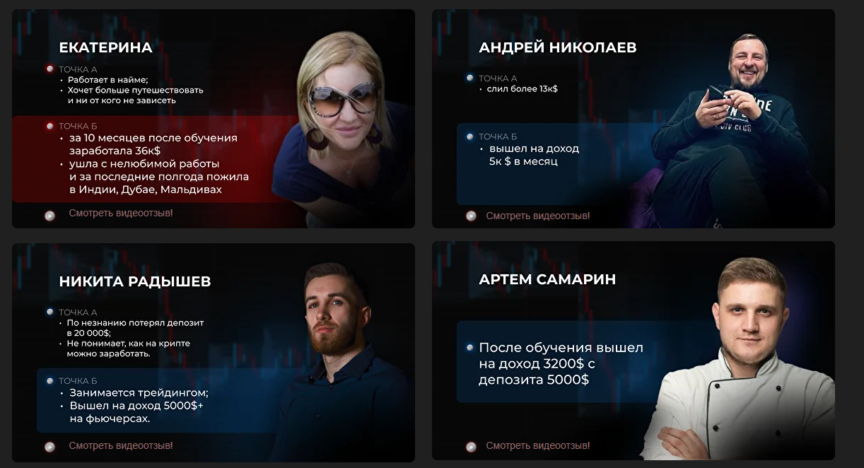 На сайте представлены отзывы, якобы оставленные довольными учениками. Для убедительности клиентам даже предлагается ознакомиться с видеоотзывами.