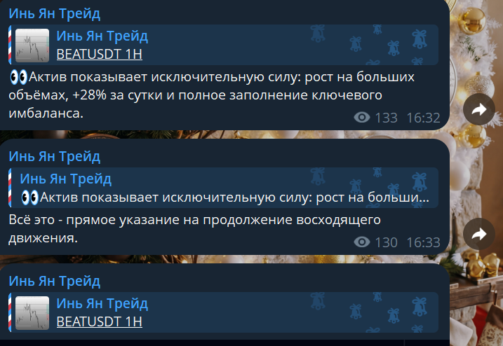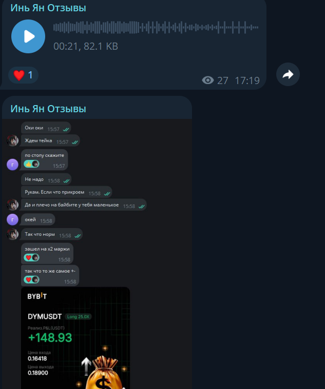 О телеграм-канале «Инь ян трейд» отзывы встречаются только на специально выделенном телеграм-канале от Pavlizz, а на внешних источниках отсутствуют. На внутренней площадке, которая не вызывает доверия, публикуются исключительно позитивные комментарии из переписок. Они содержат скрины с успешными отработками.