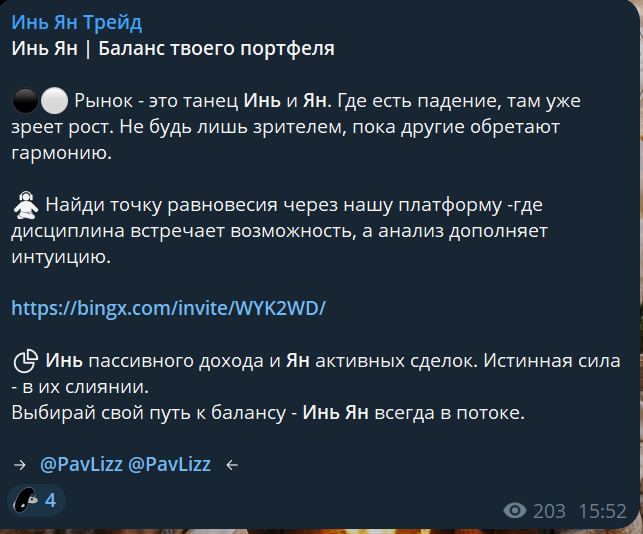 В тг-канале «Инь ян трейд» посты выкладывают сразу два трейдера, которые позиционируют себя как взаимодополняющую пару. Павел отслеживает паттерны рынка, а Елизавета считает, что хорошо разбирается в рыночной психологии. Они показывают как достигать успеха в трейдинге, балансируя между чувствами и логикой, терпением и агрессией. В этой статье мы рассмотрим, стоит ли подписываться на данный канал, что предлагают авторы и есть ли тут признаки скама.