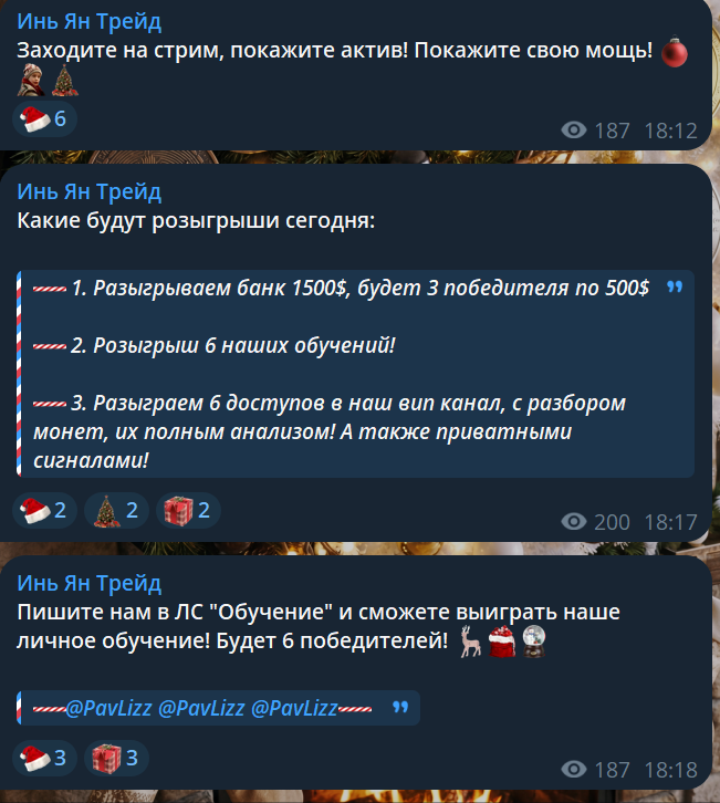 Основная часть постов в телеграм-канале «Инь ян трейд» представляет собой мотивационный контент для привлечения новых пользователей в закрытый клуб, который ведут Павел и Елизавета. Для этого нужно написать им в личные сообщения и узнать условия. С целью повышения популярности закрытого сообщества проводятся розыгрыши и конкурсы. Выплачиваются ли участникам реальные денежные призы – неизвестно, но это очень сомнительно. Остальную часть публикаций занимают анализ и графики рынка.
