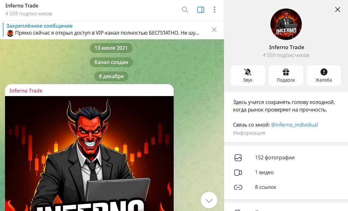 Inferno Trade — очередной псевдотрейдерский канал, где владелец скрывает свою личность и публикует только успешные сделки, умалчивая об убытках. Отсутствие верифицированной статистики и агрессивная торговля с высоким плечом делают этот проект опасным для доверчивых инвесторов. Не дайте себя обмануть очередному мошеннику, наживающемуся на чужих деньгах.