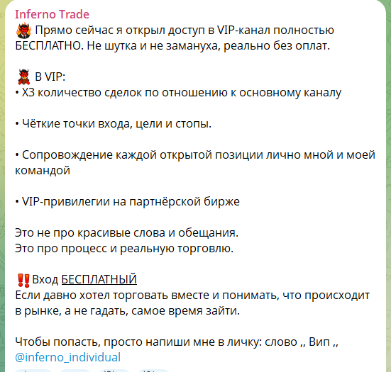 Inferno Trade — очередной псевдотрейдерский канал, где владелец скрывает свою личность и публикует только успешные сделки, умалчивая об убытках. Отсутствие верифицированной статистики и агрессивная торговля с высоким плечом делают этот проект крайне сомнительным. Не ведитесь на пустые обещания и держитесь подальше от таких «гуру».
