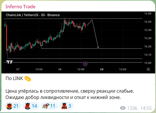 В открытом доступе публикуются торговые сигналы без объяснения логики входа. Как правило, это скрин графика с указанием направления движения цены. Обучающего контента или разбора ошибок нет — подписчикам предлагают просто повторять действия автора.