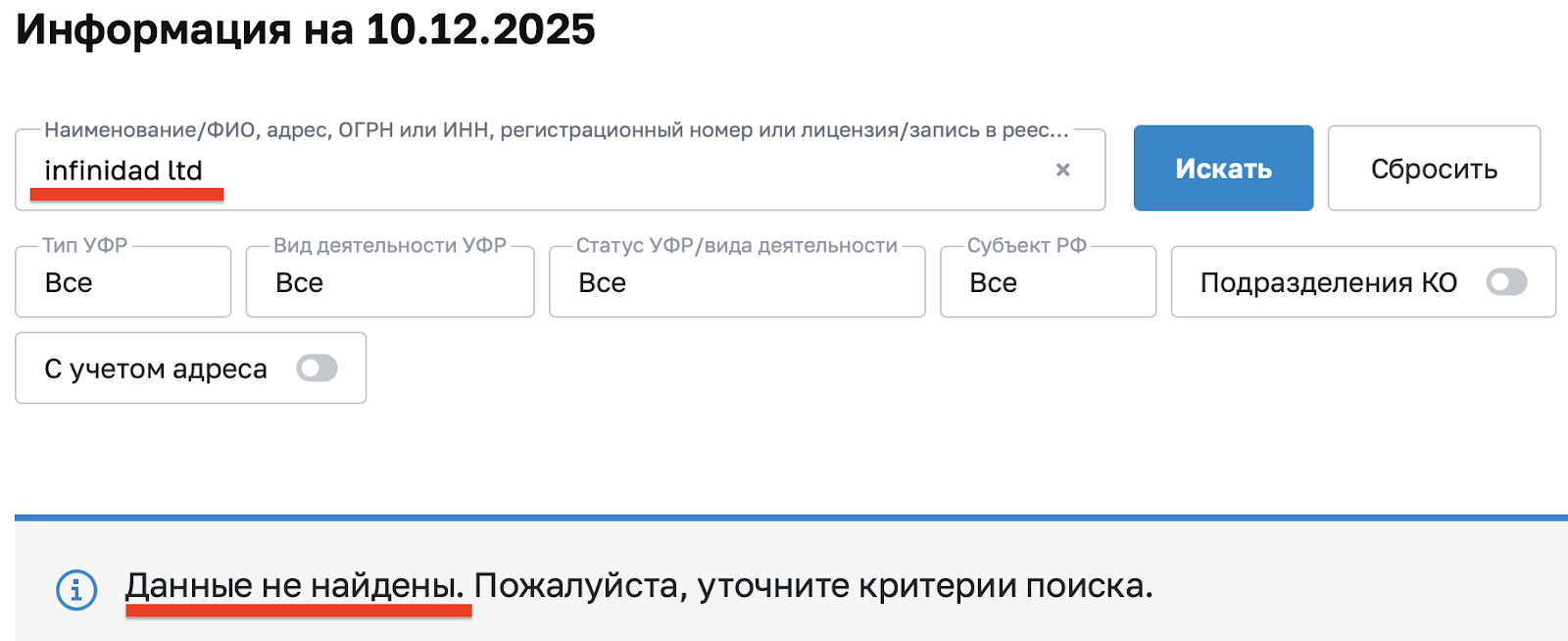 Первый критерий проверки безопасности и надежности брокера — анализ его регистрационных данных. В случае с Infinidad LTD ситуация странная: компания числится как швейцарская, при этом зарегистрирована в Британии, но по факту вовсе не оформлена. Данные о ее «лицензии» и финансовой регуляции — обыкновенный фейк для отвода глаз.
