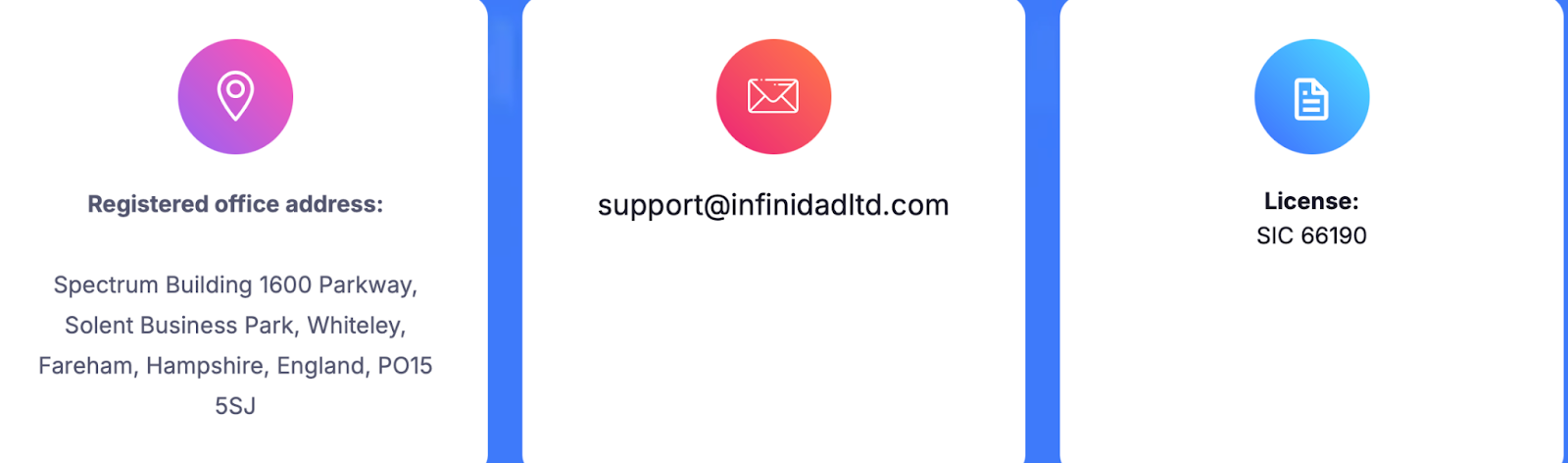 Красочные описания уже не кажутся столь заманчивыми при виде скудной контактной информации и сомнительного адреса. На сайте указано, что компания Infinidad ltd — биржа, зарегистрированная в Швейцарии. Приведенный адрес проверку на достоверность не проходит и отношения к брокеру не имеет. Для обратной связи приведен только электронный адрес support infinidadltd com и через общение во встроенном чат-боте. Также создатели указали номер лицензии, однако и его проверка по реестрам совпадений не выявила.