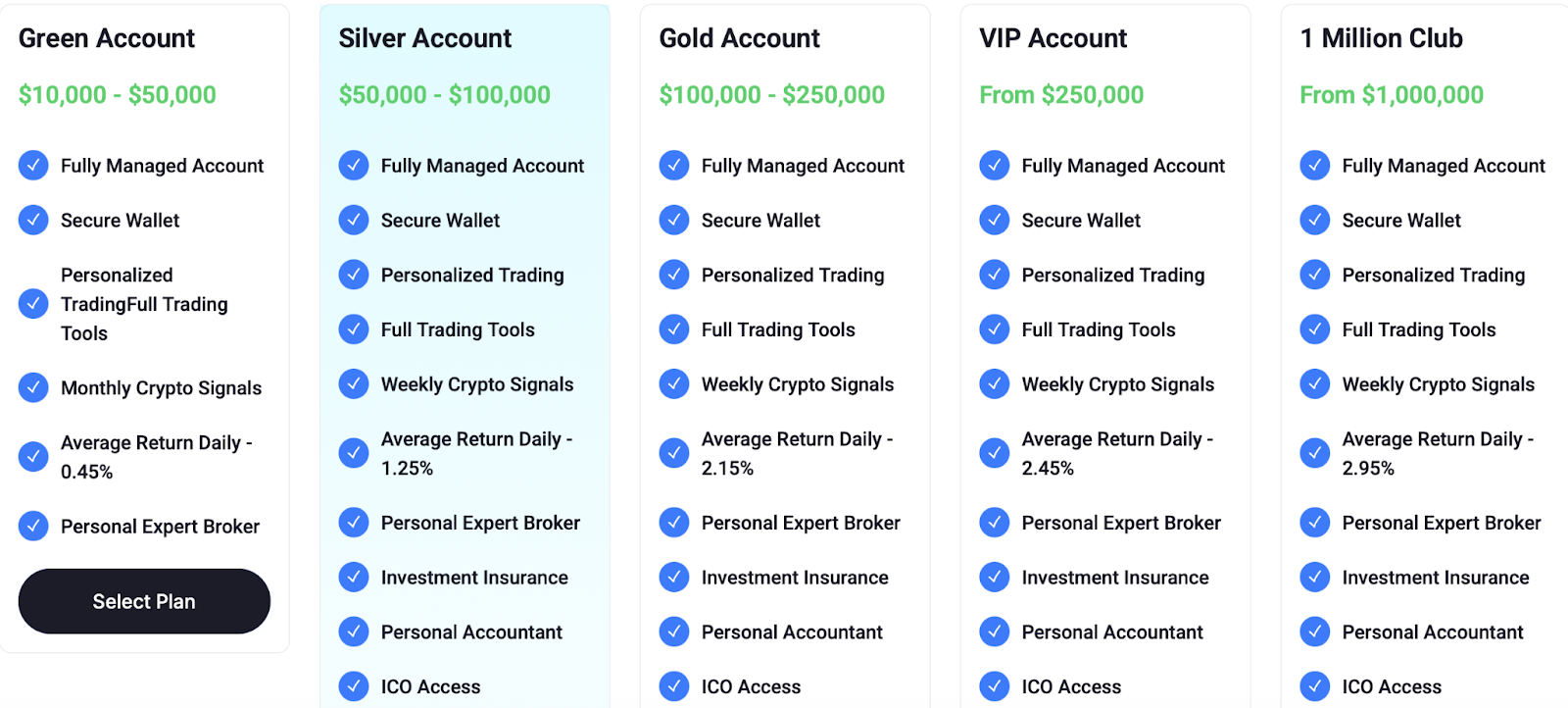 На официальном сайте платформы нет подробного перечня с указанием сервисных сборов и комиссий за ее использование. Вместо этого опубликована классификация торговых планов с градацией от базового «зеленого» до продвинутого. Базовый план позволяет торговать на сумму от $10 тысяч и гарантирует трейдеру доходность чуть менее 0,50% в сутки.