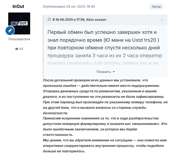 Обменник InOut Exnchange реально работает и уже 8 месяцев зарегистрирован на крупных агрегаторах. За это время в публичном поле было всего 2 спорных ситуации. Несмотря на это, в правилах пользования и AML-политике есть подозрительные и рискованные пункты, так что клиенту стоит быть осторожнее.