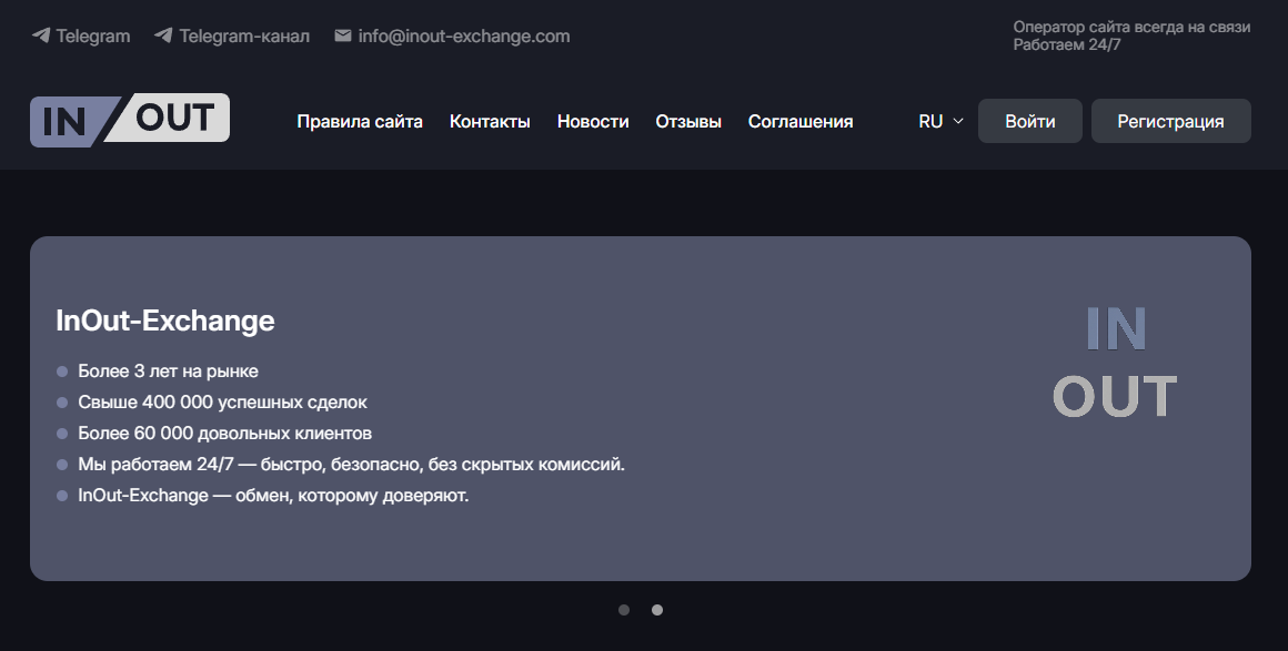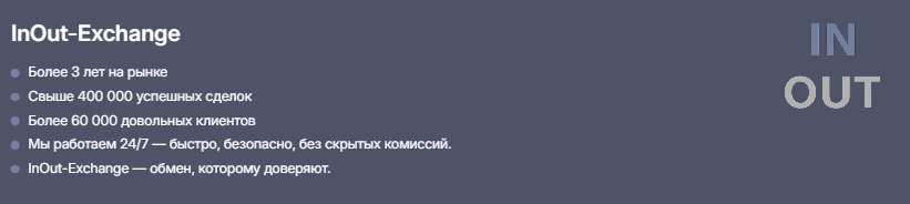 InOut Exchange — обменник криптовалюты, работает с июля 2025 года. Предлагает все популярные направления по токенам и фиату. Работает 24/7, без перерывов, на техподдержку сильных жалоб нигде не было.