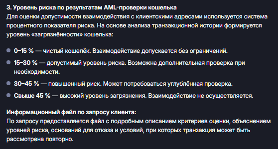 В AML-политике тоже есть два спорных момента. Первый — ограничения по рискам. До 45% кошелек еще пройдет, а после — уже нельзя. Это очень низкие цифры. Сейчас такие показатели могут дать, если просто посмотреть в сторону миксера. AML-чекер не раскрывается, что дает возможность придумать аргумент про «грязную крипту» в любой момент.