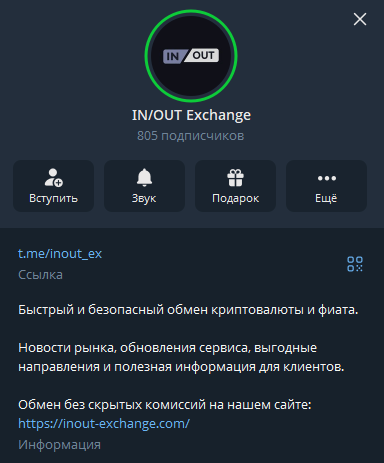 Обменник ведет сообщество в Telegram IN/OUT Exchange (inout_ex) на 800 подписчиков. Посты собирают от 130 до 150 подписчиков. Комментарии закрыты. Если накрутка и есть, то минимальная.