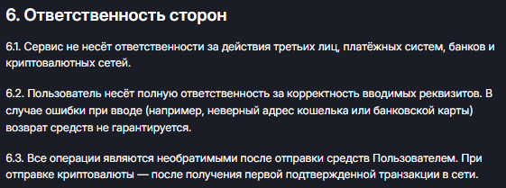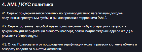 Обменник InOutExchange составил собственные правила пользования. За шаблон взяли другие пункты, но адаптировали под себя. Это небольшой, но плюс. Мошенники просто копируют разные пользовательские соглашение и даже не думают, как они выглядят.