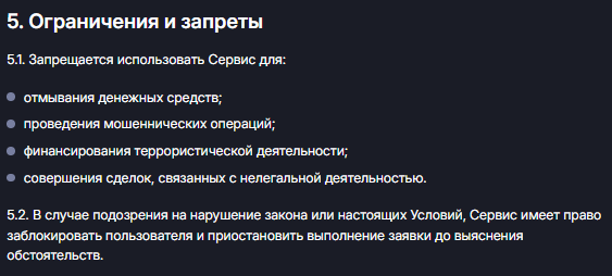 В пользовательском соглашении есть несколько спорных и подозрительных пунктов. Первый — в случае возникновения подозрений, сервис останавливает транзакцию и блокирует пользователя. Формулировка размыта, конкретики нет.