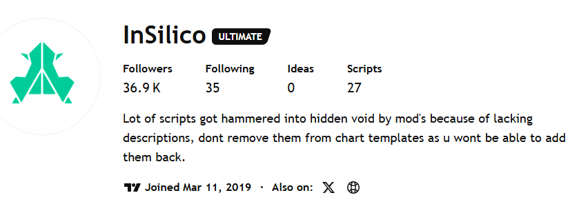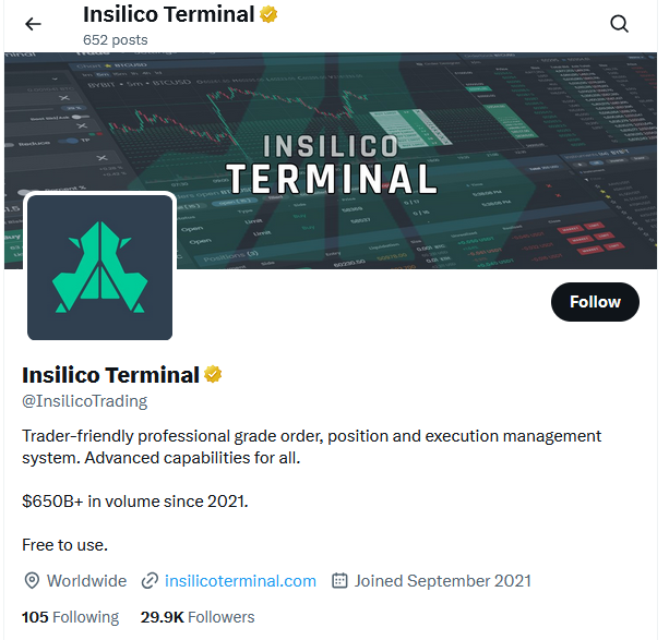 Эти цифры не выглядят завышенными. Сервис нельзя назвать крупным, но он достаточно популярен в социальных сетях. Например, на официальный аккаунт InSilico на TradingView подписано почти 37 тысяч пользователей. В Х за новостями сервиса следят 29,9 тысяч подписчиков: