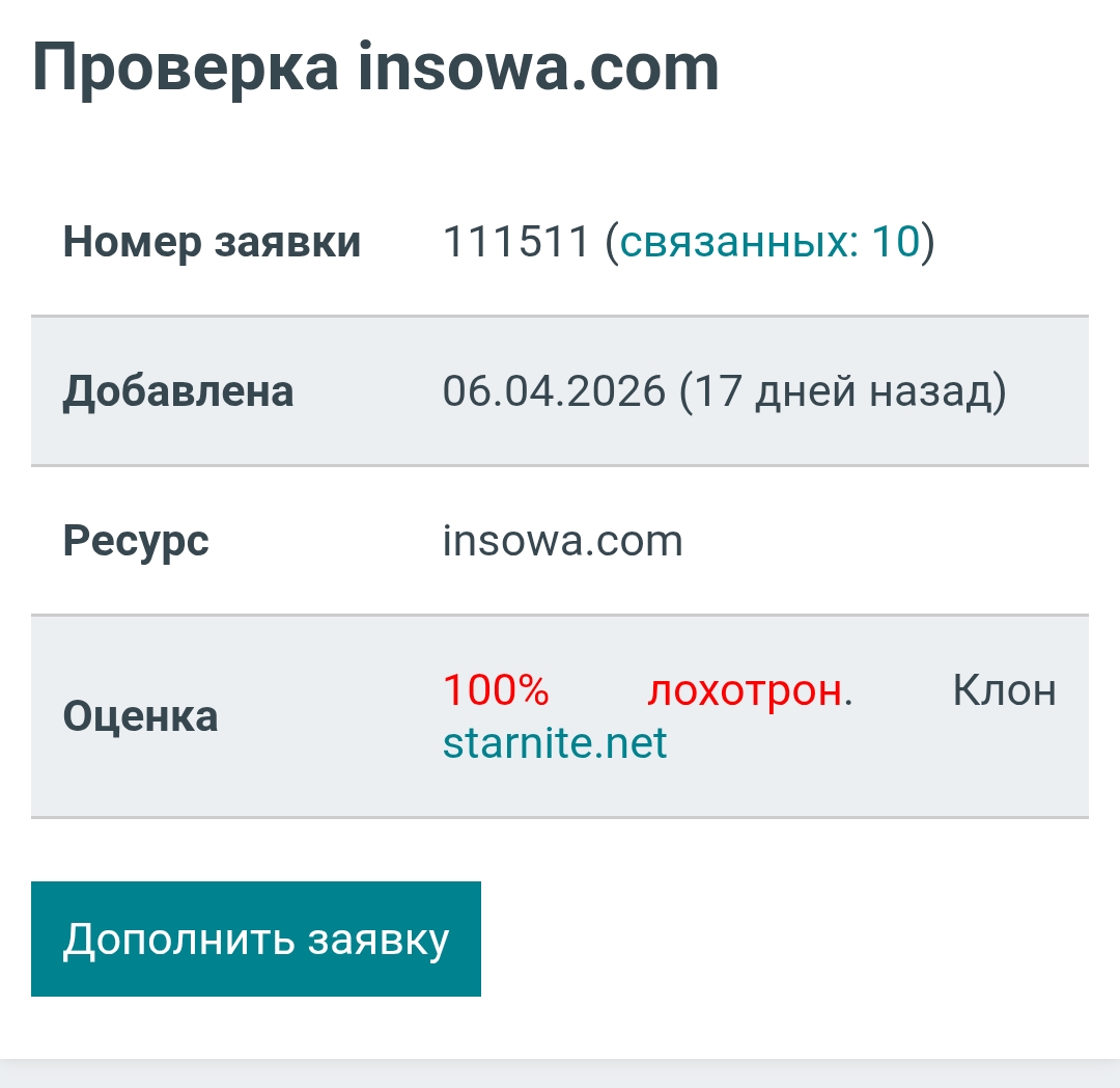 По нашим данным, после отправки запроса высвечивается статус «в обработке», а далее сумма просто не приходит. Поддержка объясняет задержку подозрительной активностью аккаунта и требует оплатить дополнительные сборы: налог на прибыль или страховку. Кроме того, нам удалось выяснить, что Insowa com принадлежит сети клонов.