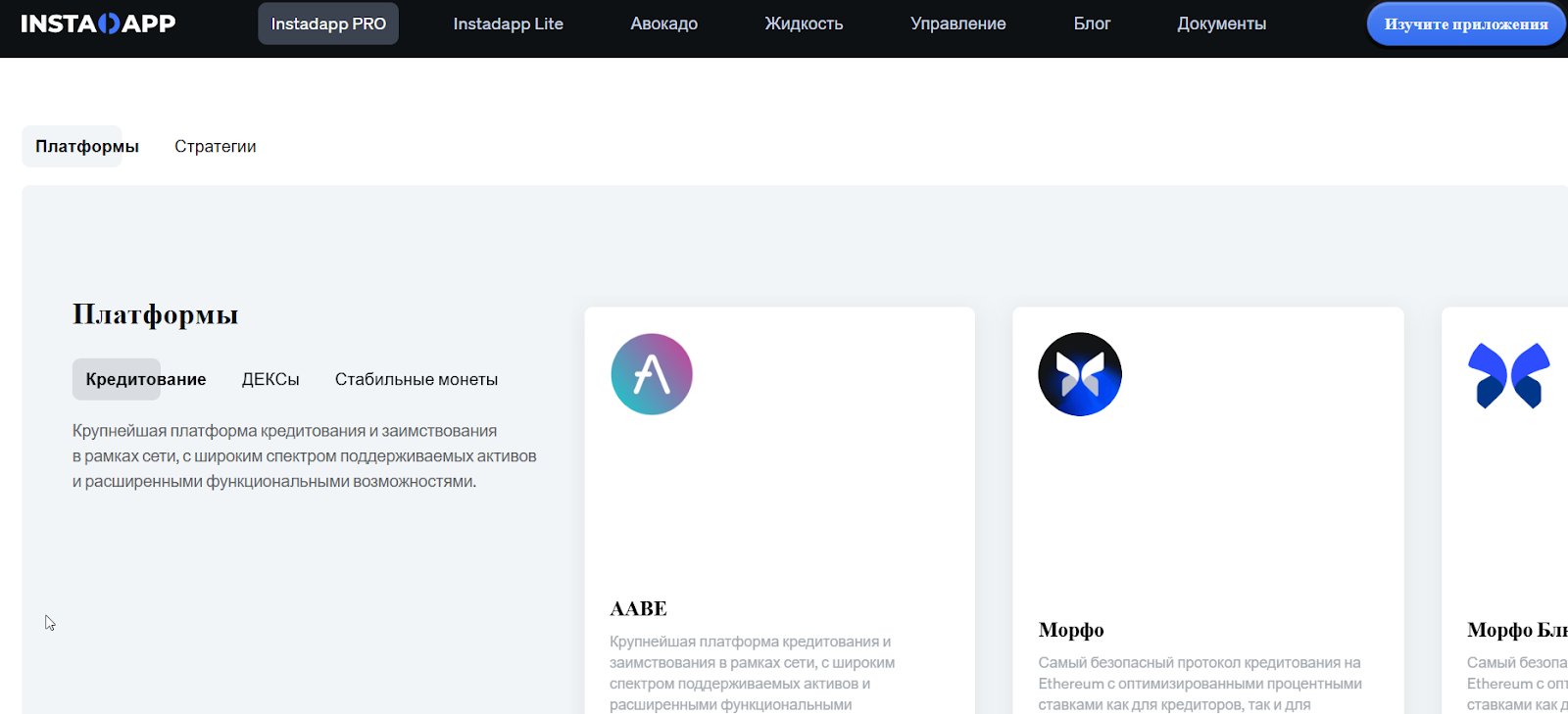 Платформа выступает своего рода «агрегатором» DeFi-сервисов. Instadapp объединяет популярные протоколы вроде: