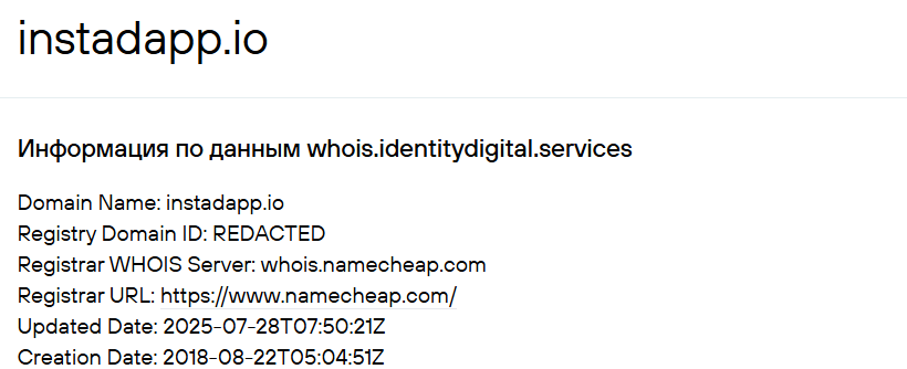 Сайт «Инстадапп» был зарегистрирован в интернете в 2018 году, но 28.07.2025 здесь произошли обновления. Можем предположить, что с этого момента компания Instadapp и начала обслуживание клиентов. Другими словами, на 05.03.2026 организации с высокой долей вероятности нет и года.