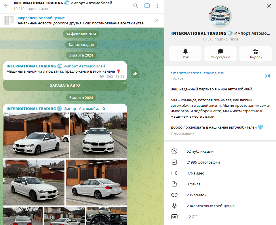 INTERNATIONAL TRADING (international trading rus) – сообщество в Телеграмм, на котором пользователям предлагают приобрести автомобили, пригнанные из разных стран. За сообществом стоят несколько администраторов, каждый из них работает с различными регионами: Европа, Южная Корея, ОАЭ и др. О проекте INTERNATIONAL TRADING привоз авто отзывы не представлены. Мы провели его проверку.