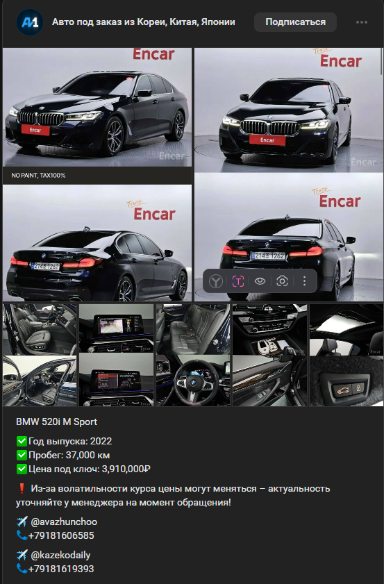 На канале пользователям предлагаются услуги по пригону автомобилей из-за рубежа. Некоторые предложения выглядит подозрительными. Например, указанная цена под ключ указана без учета утильсбора. Для сравнения приведен пример стоимости с сайта того же дилера, с сайта которого авторы проекта размещают фото на своем канале: