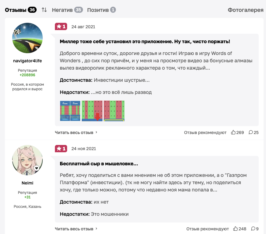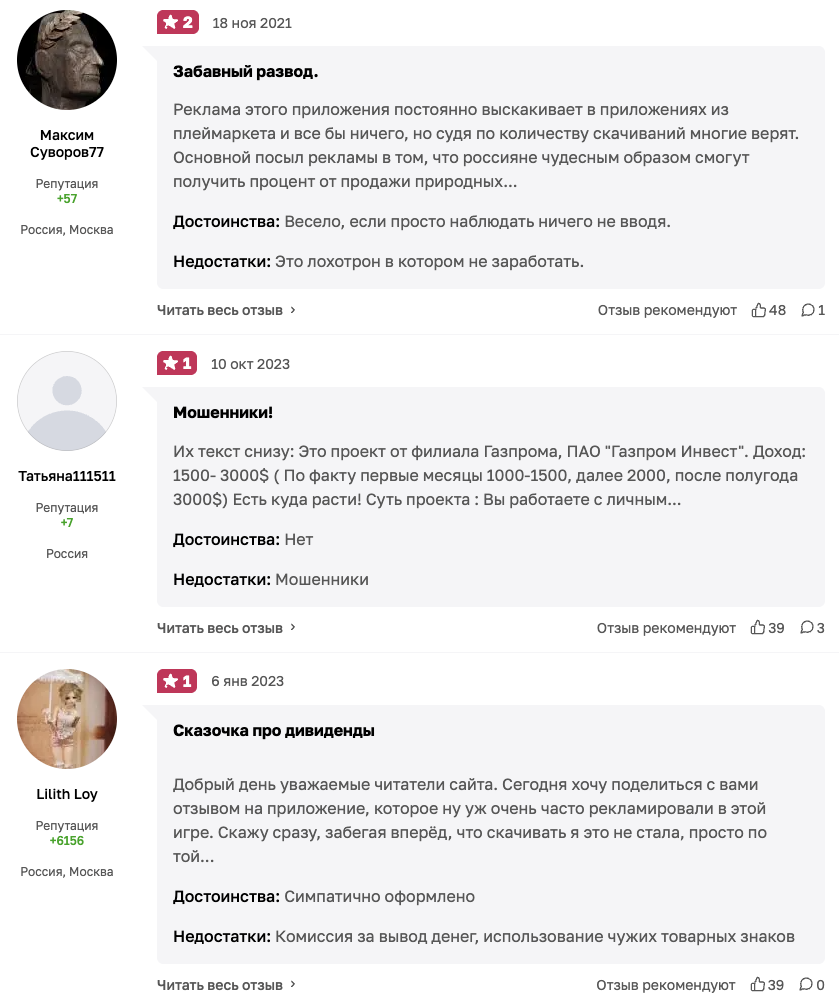 Из этого следует вывод, что многие из этих ревью касаются не реальной фирмы, которая связана с «Газпромом», а фейковых инвестиционных платформ.