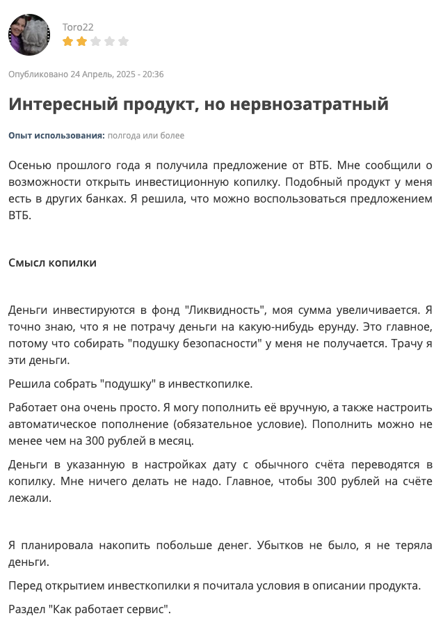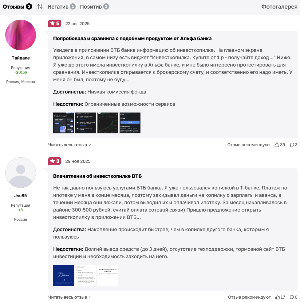 Фидбэк о проекте в интернете является довольно негативным. Авторы отзывов об инвестиционной копилке от ВТБ предупреждают, что работа с сервисом непрозрачна.