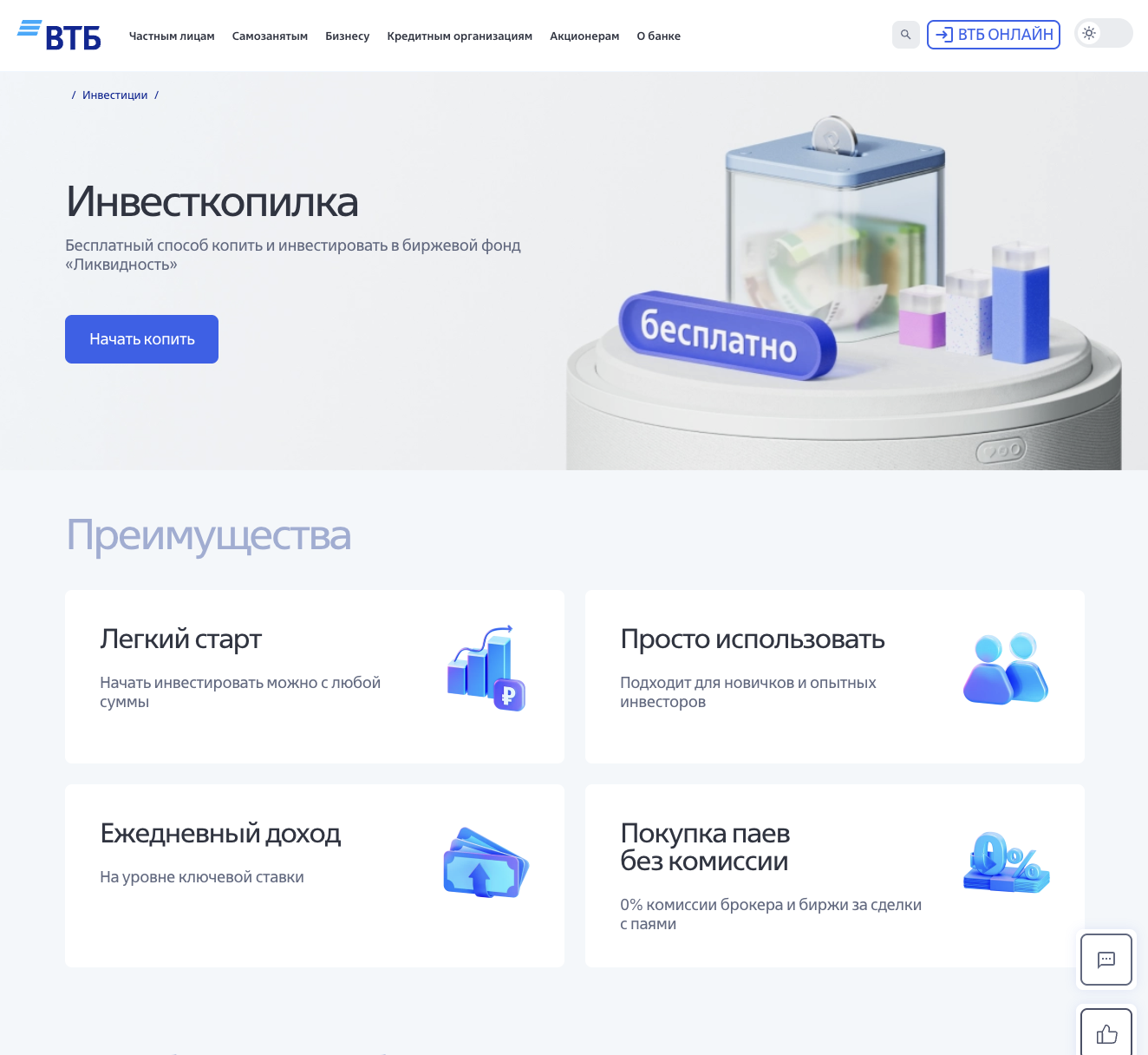 Инвестиционная копилка в ВТБ — это платформа для новичков в финансировании. На ней предоставляют инструменты для покупок долей в паях без комиссий.