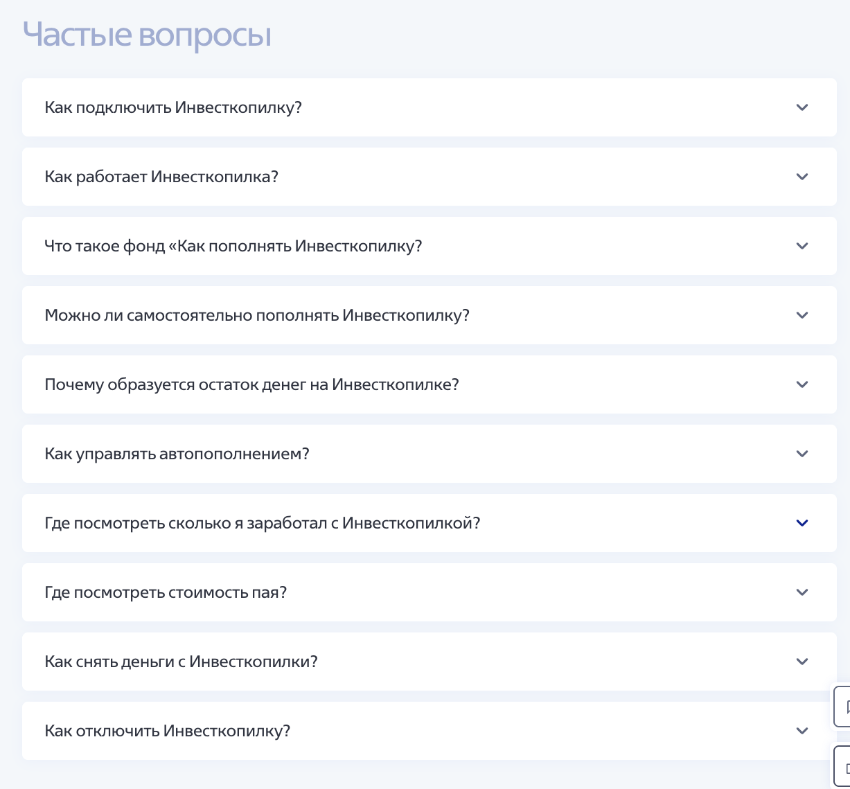 На странице с описанием продукта присутствует блок «Частые вопросы». Он содержит информацию о том, как: открыть и закрыть аккаунт, вывести, снять деньги и т.п. Если у человека есть другие вопросы, которые отсутствуют в списке, он может обратиться в техподдержку сервиса.