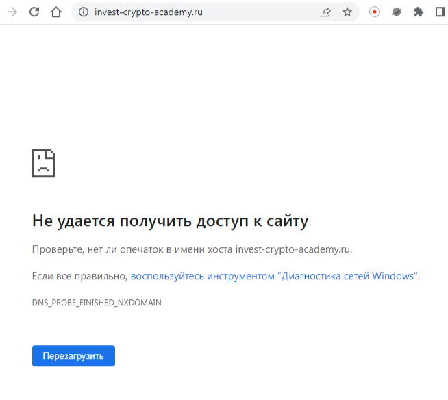 К сожалению, на момент изучения работы ресурса «Инвест Крипто Академия Hide», его официальный сайт оказался недействительным. Не открывается он и с помощью впн-сервиса, что говорит о его блокировке на территории всего мира. Предупреждения о мошенничестве от браузера нет.