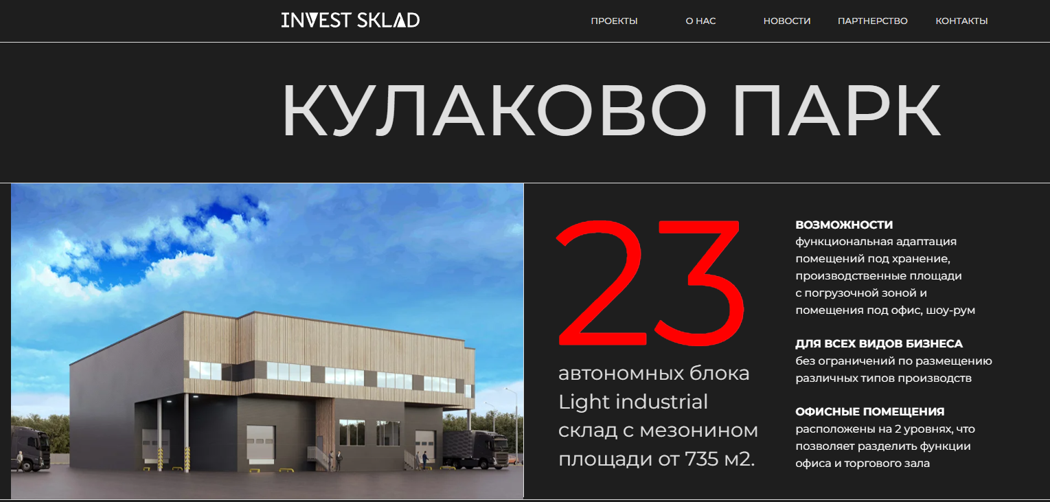 На официальном сайте investsklad ru описано интересное предложение. Клиентам предлагают купить один из автономных блоков (или его часть) в Московской Области. Площадь — до 735 кв.м.