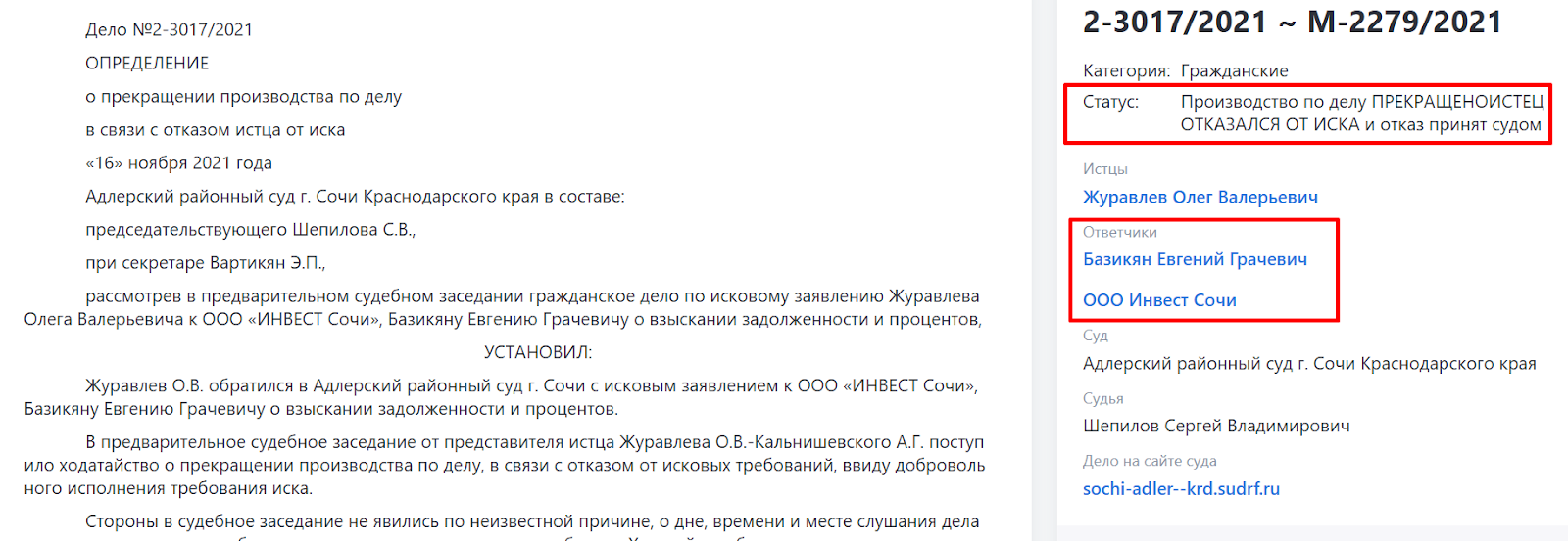 В судебных записях можно найти упоминание о прекращении производства дела 2021 года. Базикян Евгений Грачевич выступал в качестве ответчика, с которого необходимо было взыскать задолженность и проценты. Очевидно речь идет об обманутом вкладчике. Однако истец отказался от иска. Судя по всему, Евгений Базикян решил уладить вопрос полюбовно. Есть запись о добровольном исполнении требования иска.