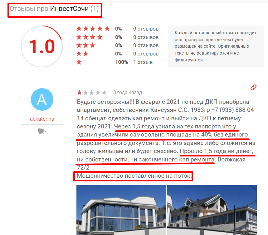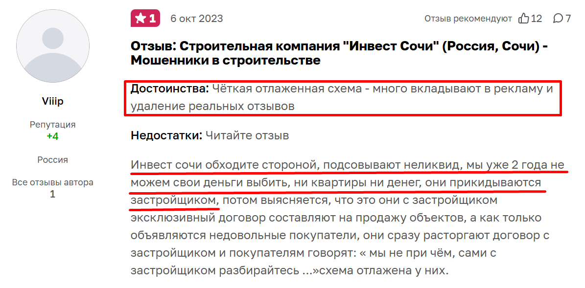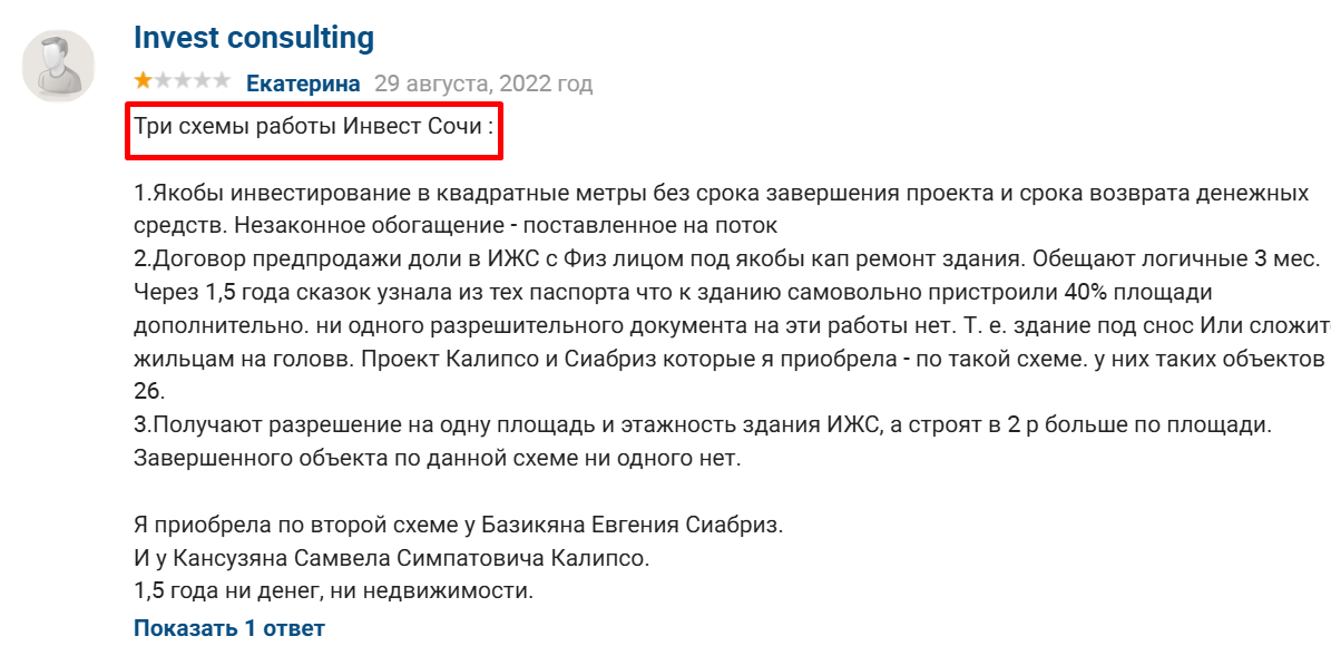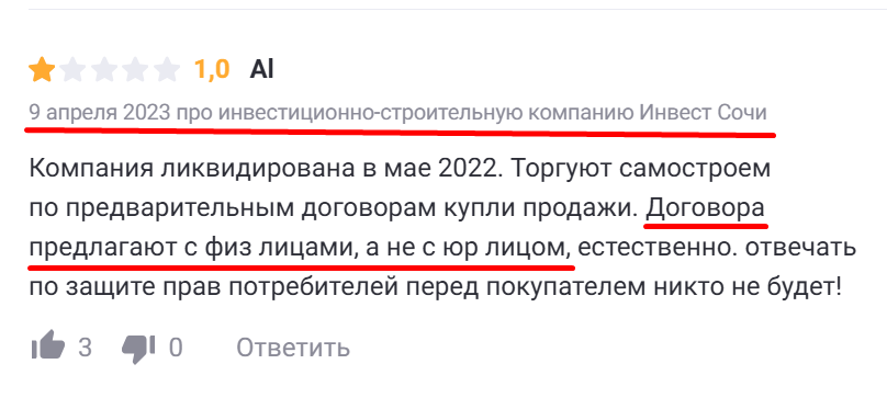 Инвест Сочи — звучит солидно, только вот договор заключается почему-то не с юридической фирмой, а с обычным физ лицом! Гарантий никаких нет, как и хоть каких-то отзывов от довольных клиентов! Сразу пропало желание с ними сотрудничать!