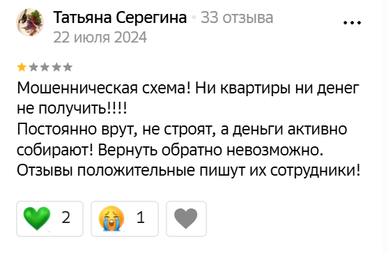 Вкладчики уже выяснили, что компания ликвидирована в мае 2020 года. Занимающиеся самостроем и мошенническими схемами, аферисты сами клепают положительные отзывы и не исполняют своих обязательств перед клиентами.